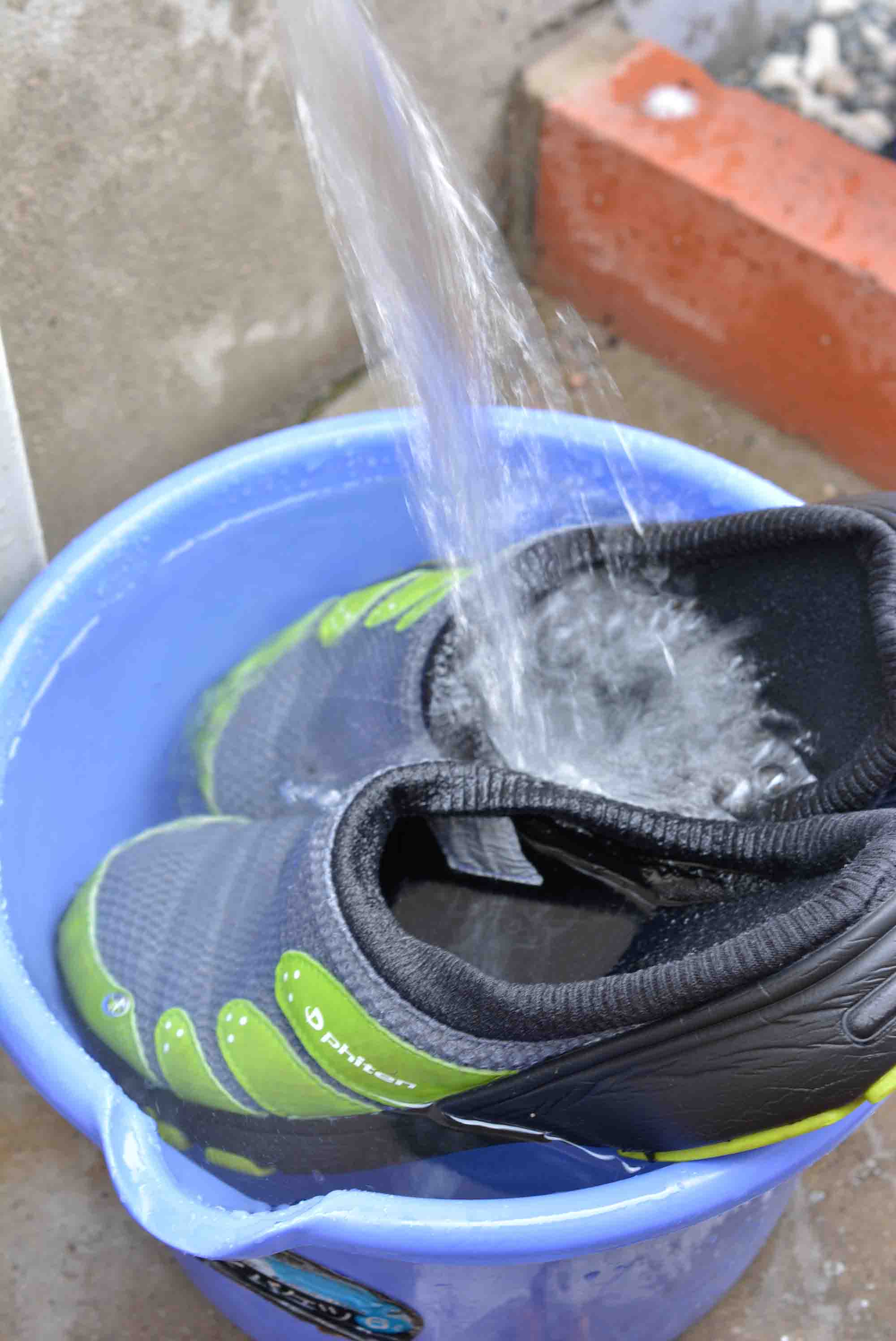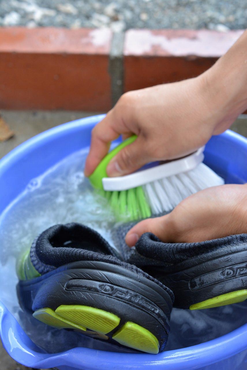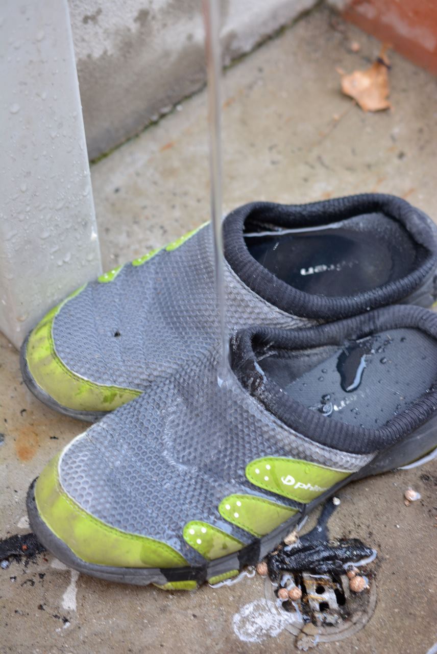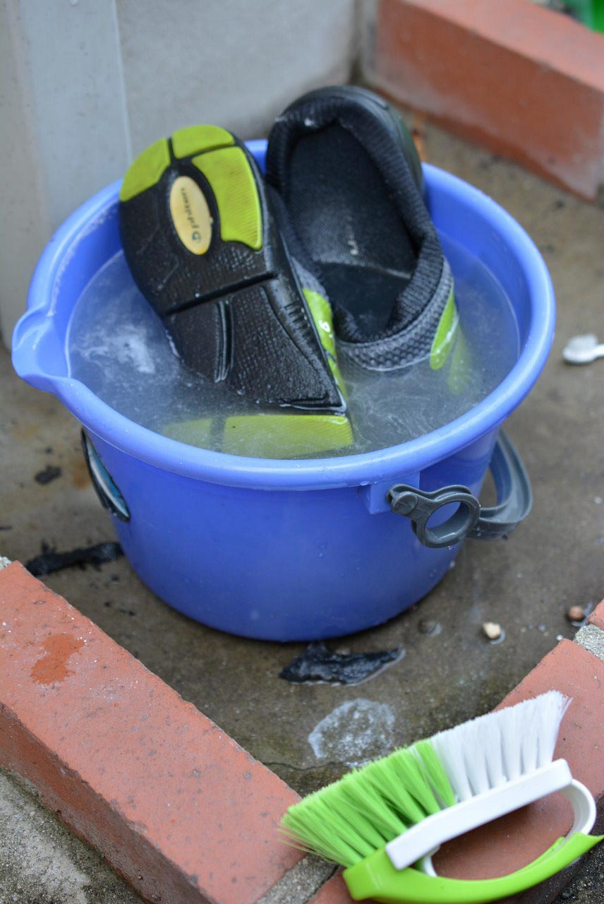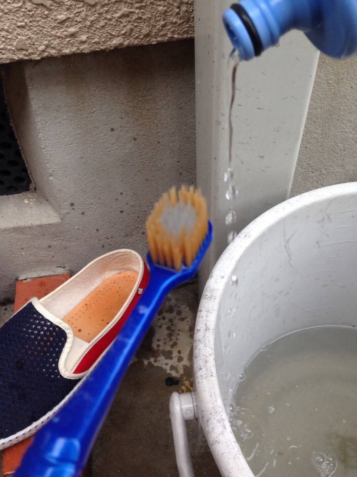 その間にサンダルに水をかけて、水を浸透させておきます。洗剤液とのなじみが良くなります。