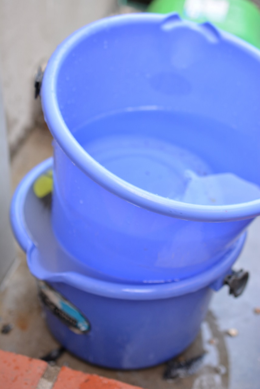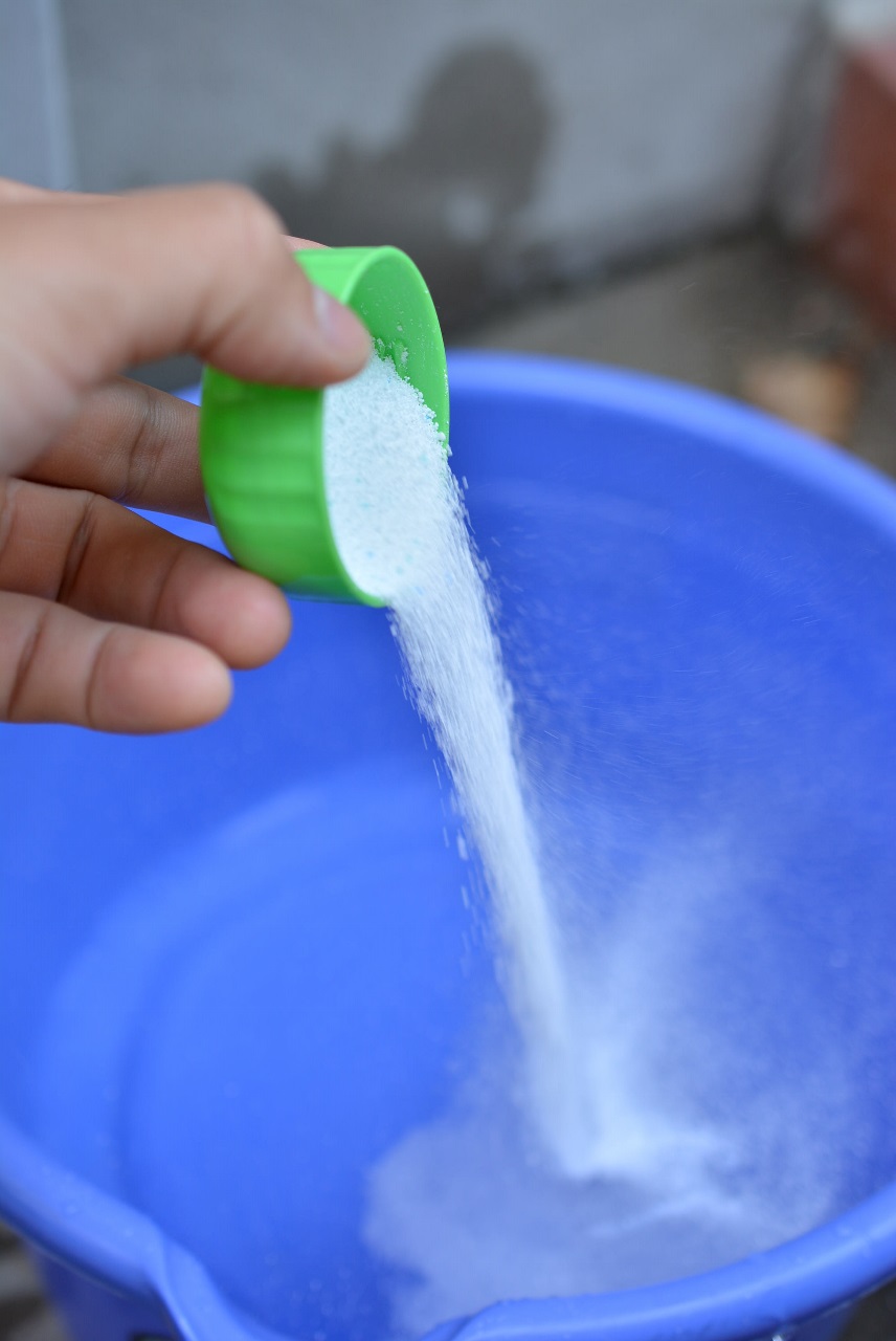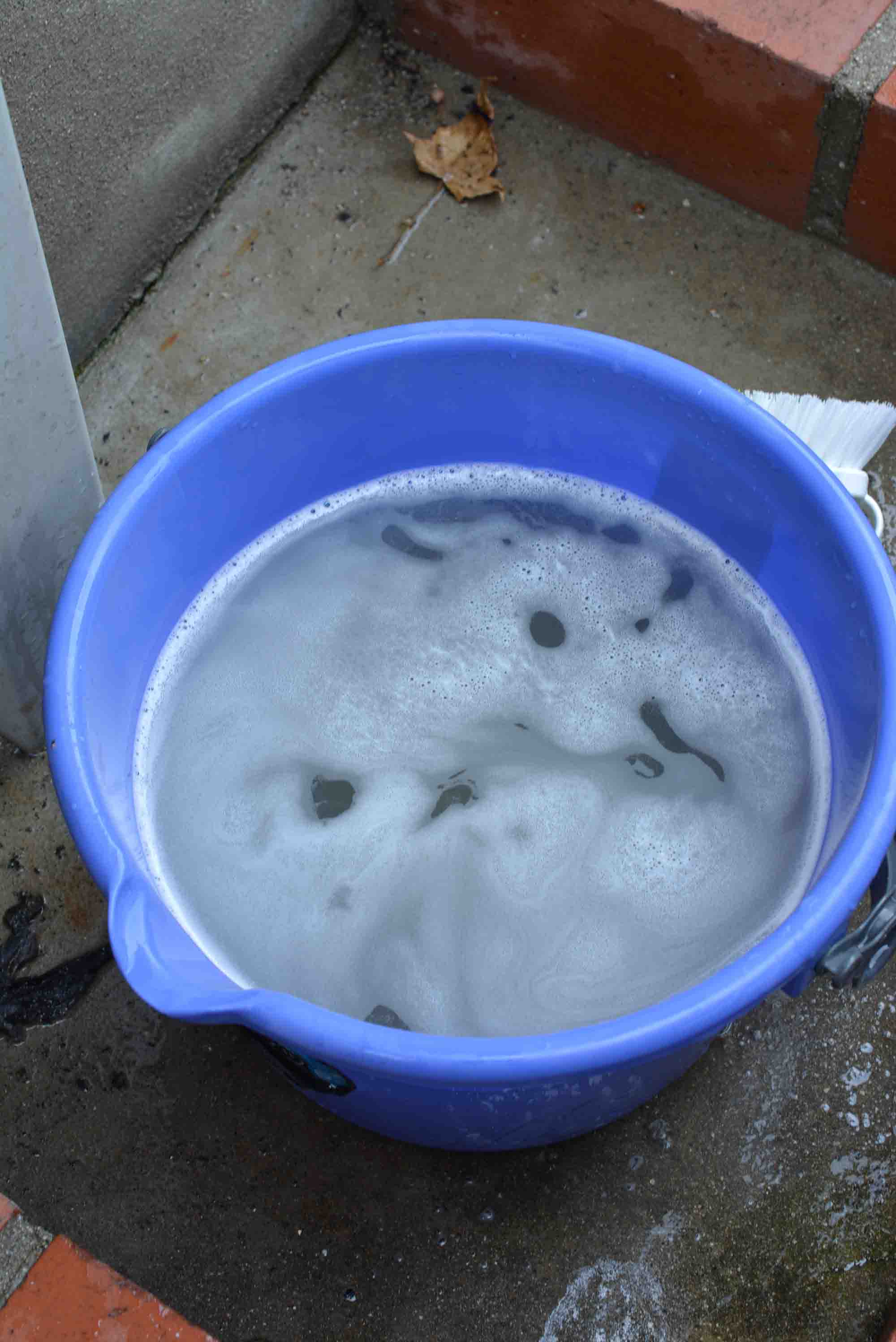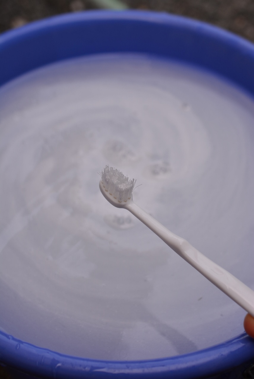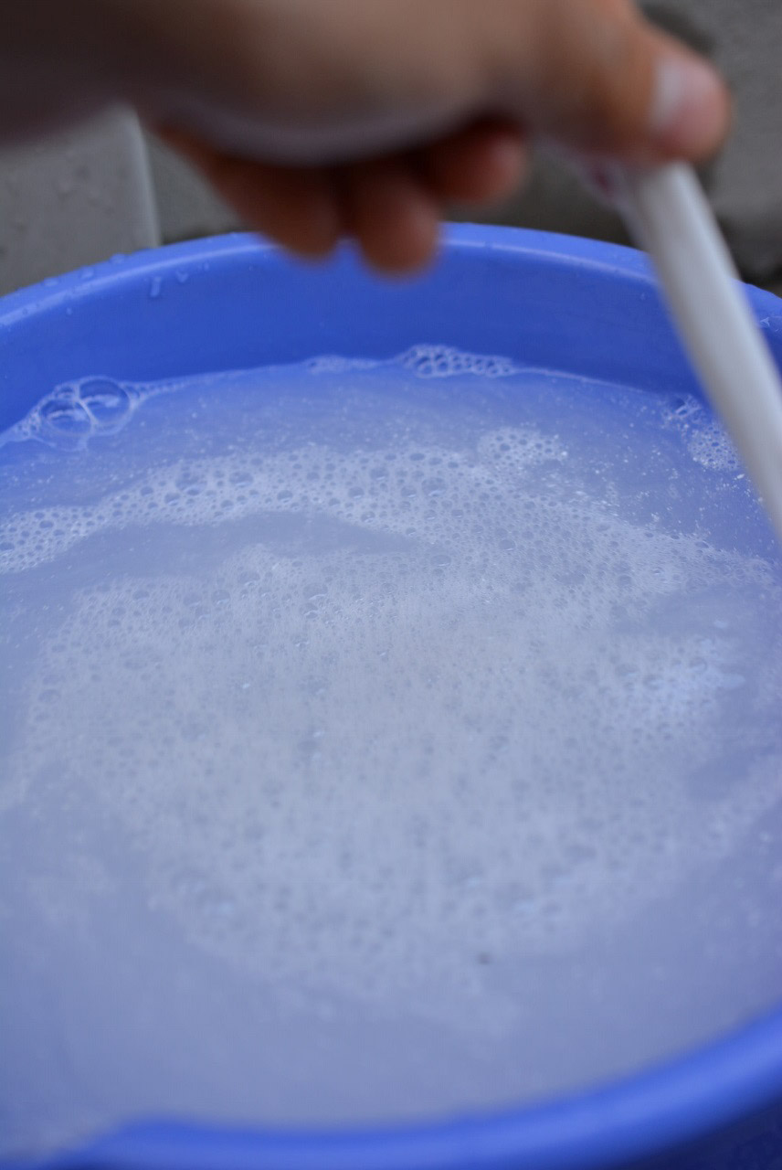 バケツに水を張りながら、洗剤を入れて掃除用の歯ブラシで混ぜていきます。