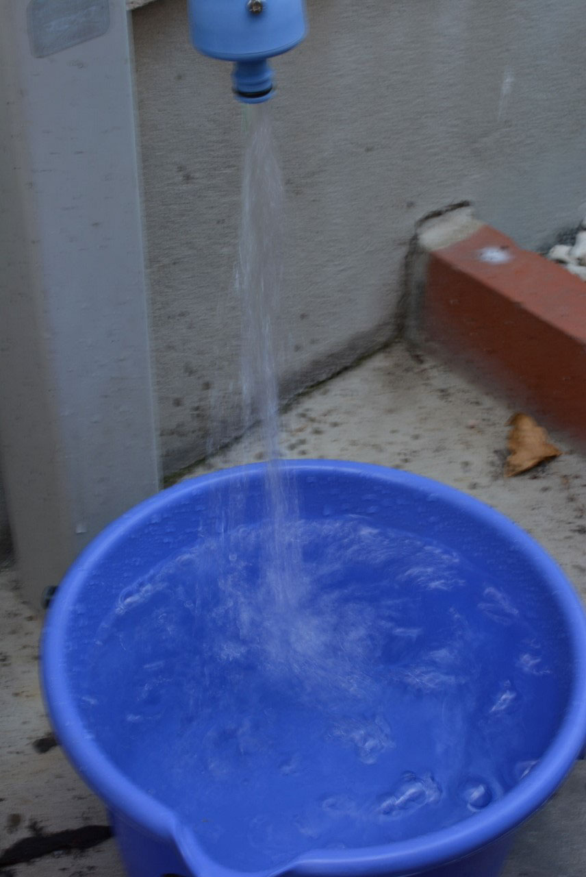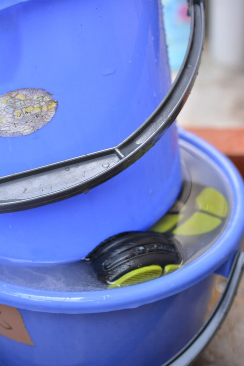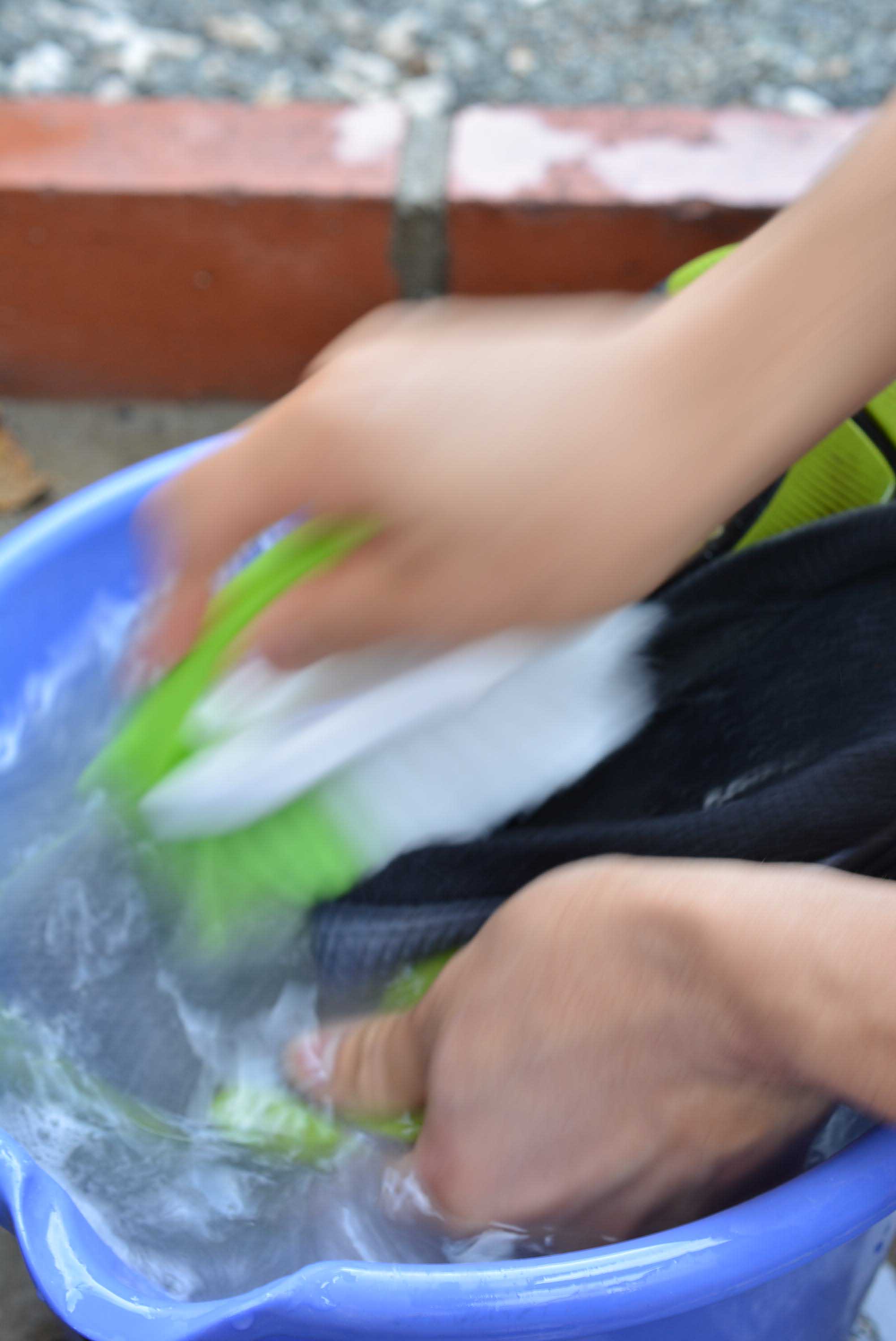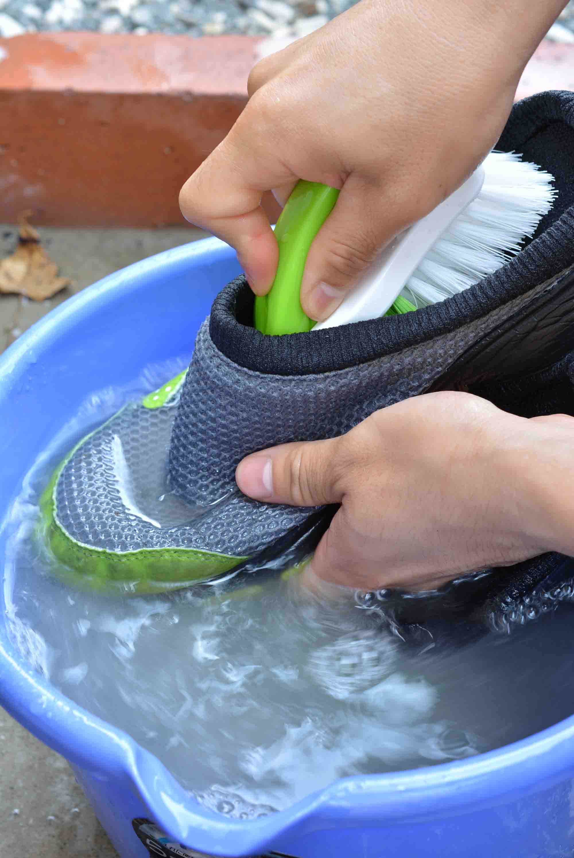 バケツに水を張りながら、洗剤を入れて掃除用の歯ブラシで混ぜていきます。