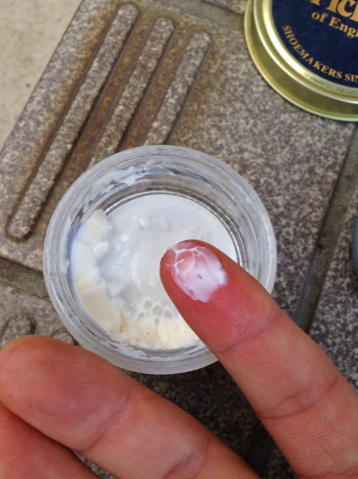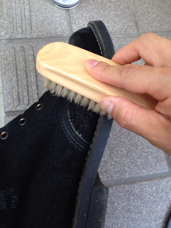 指で入れると、クリームの節約になります。塗り込んで少し時間をおいてプロホワイトブラシで全体になじませましょう。なじませているうちにある程度つやが出てきます。