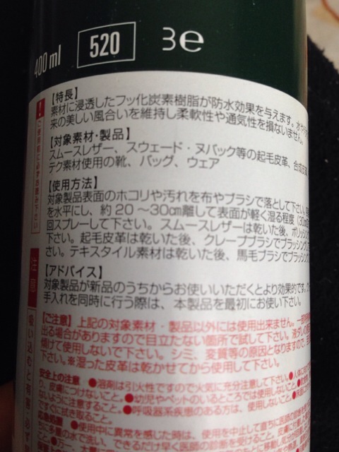 こちらは、即効性はあまりないものの、スエードの靴にも使える万能性や、WOLY社の防水スプレーに比べると単価が安いので割と気軽に使えるというメリットがあり、私は専らこちらを使用しています。フッ素系です。においはあります。まぁ許容範囲です。