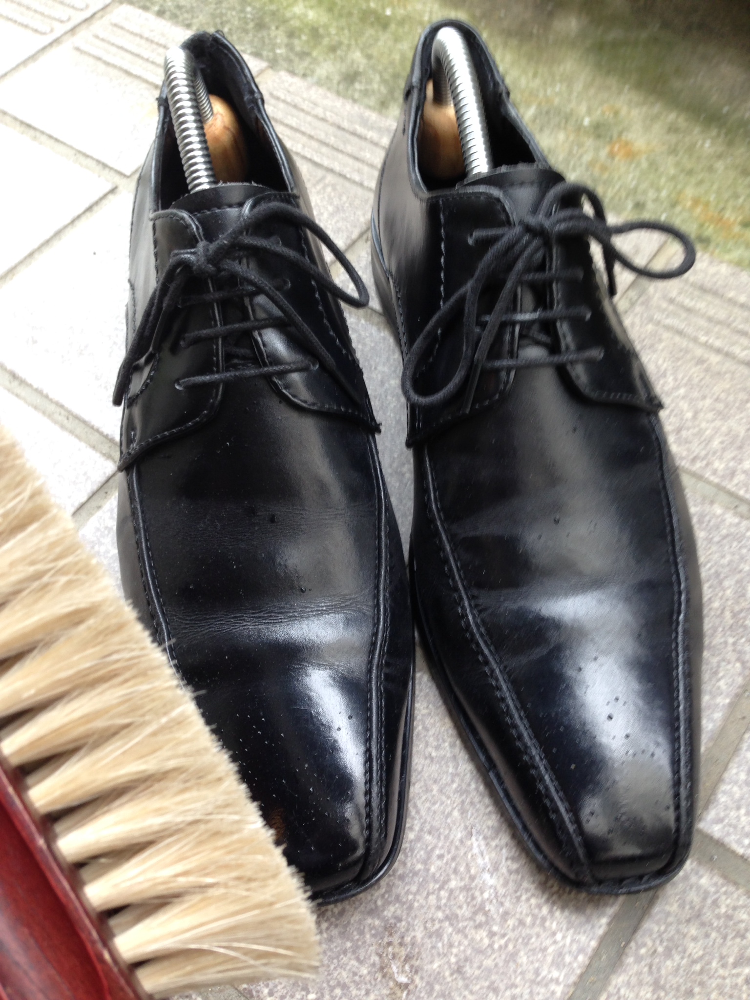 ただ、これだけは確実に言えるのですが、定期的にクリームを入れて靴磨きをしている革靴であれば、防水スプレーがなくても多少の雨ならなんとでもなります。