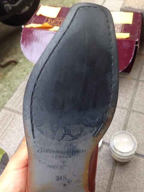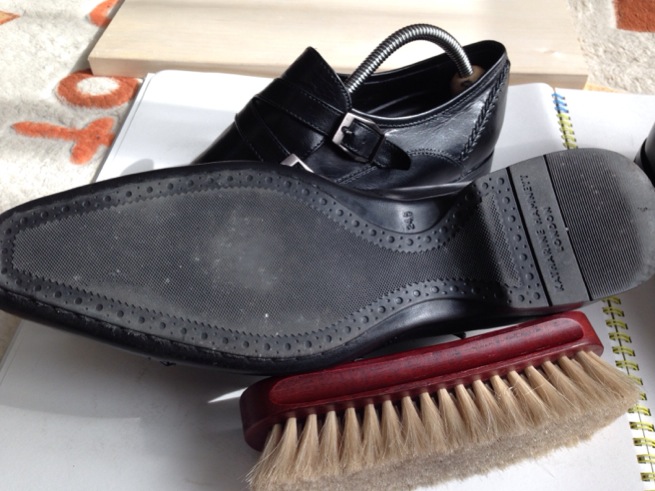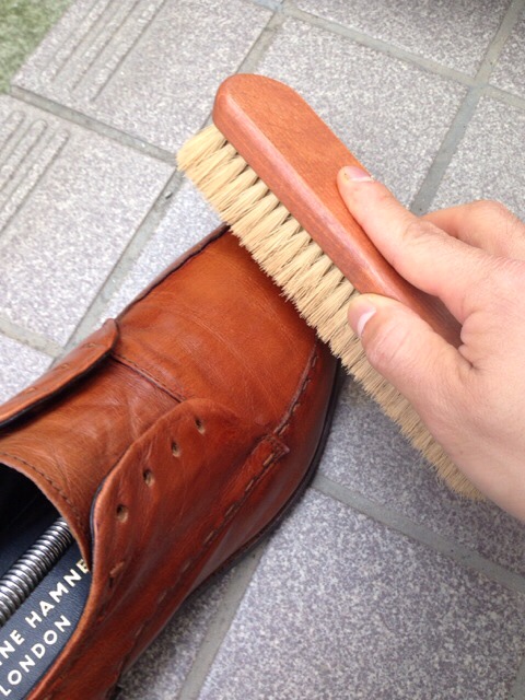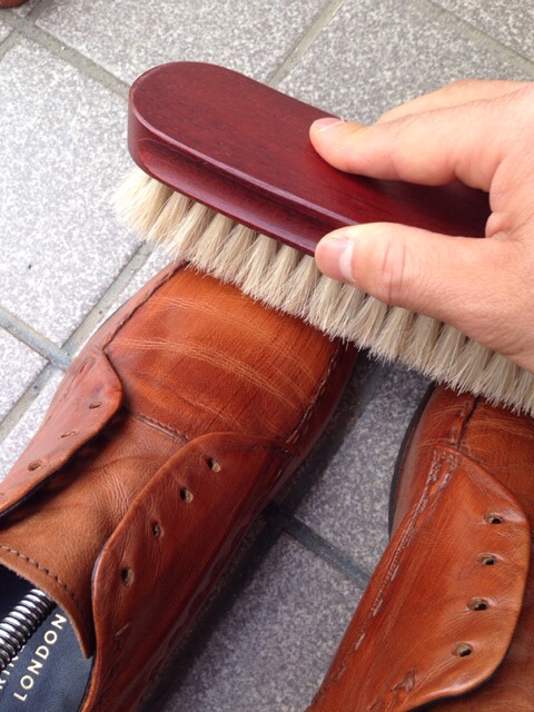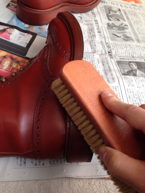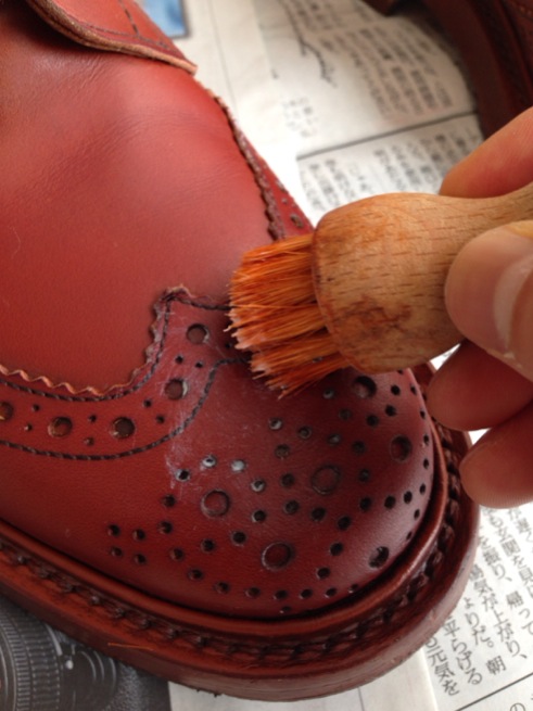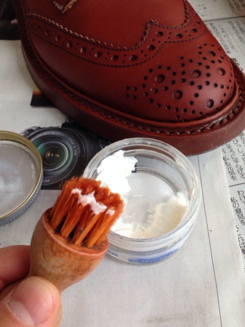 デリケートクリームを入れた後に、プロホワイトブラシ(化繊ブラシ)で均一になじませます。また、レザーソール用のクリームを持っていれば、ソールをブラッシングした後に添付すると、持ちが良くなります。持っていなければ、デリケートクリームを入れましょう。