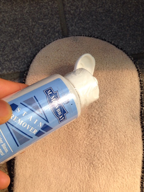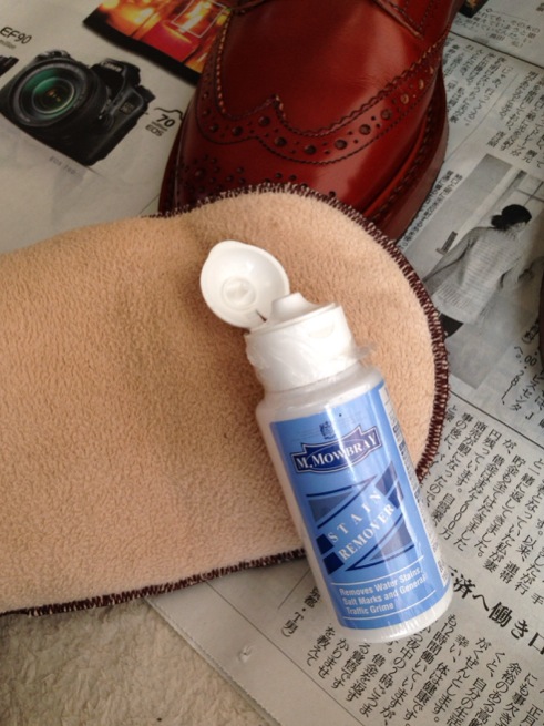 ブラッシング後、ステインリムーバーを少量グローブクロスにたらし、古いクリーム等、汚れを落としましょう。ささっと撫でるように拭きます。