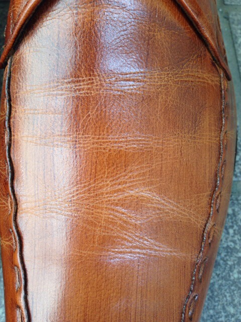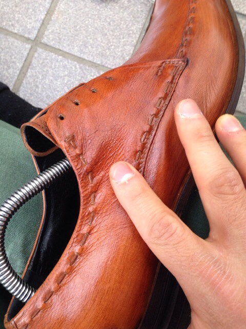 乾燥してますねー、この革靴は2か月ぐらいクリームを入れていなかったので、アッパーのカーフが、かさかさっとしてます。