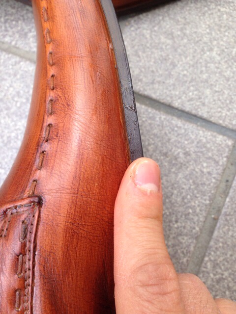 ここで革の状態をもう一度みます。乾燥気味であったのは目視で分かりましたが、羽根の内側など、予想以上にくたっとしており、今回は
