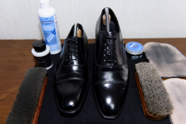 仕上げ磨きに焦点を当てた記事を書きたいと思います。最初に、スムースレザー(ツヤ革)の革靴の、一般的な