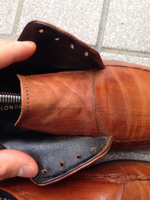 ここで革の状態をもう一度みます。乾燥気味であったのは目視で分かりましたが、羽根の内側など、予想以上にくたっとしており、今回は